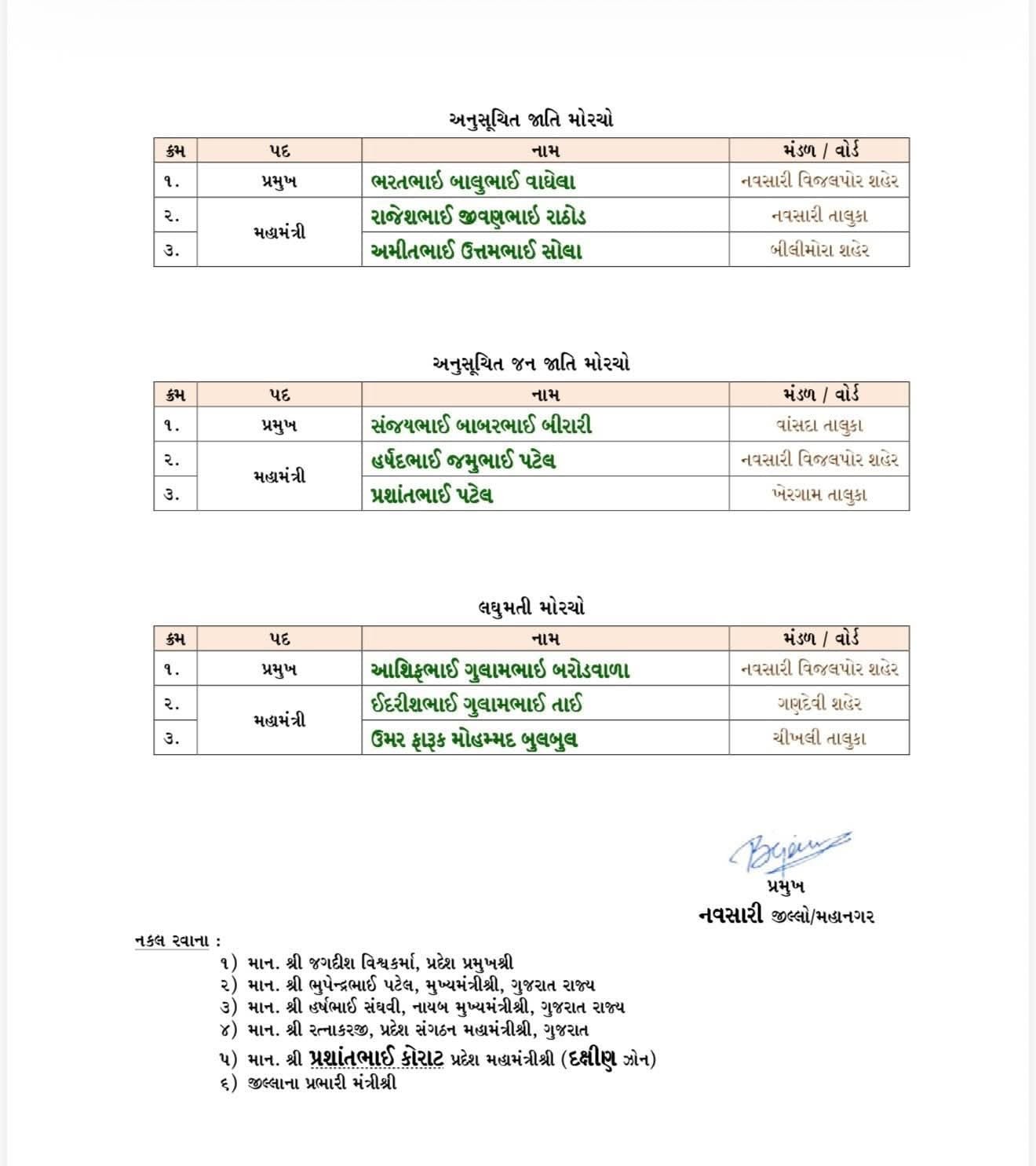 ભાજપે જિલ્લાકક્ષાએ આઠ મંત્રીઓની પણ નિમણૂક કરી છે, જેમાં ગણદેવી, જલાલપુર, વાસદા, ચીખલી અને બીલીમોરા સહિતના વિસ્તારોનું પ્રતિનિધિત્વ સામેલ છે. મહિલા, યુવા અને સામાજિક પ્રતિનિધિત્વને પણ વિશેષ મહત્વ આપવામાં આવ્યું છે.