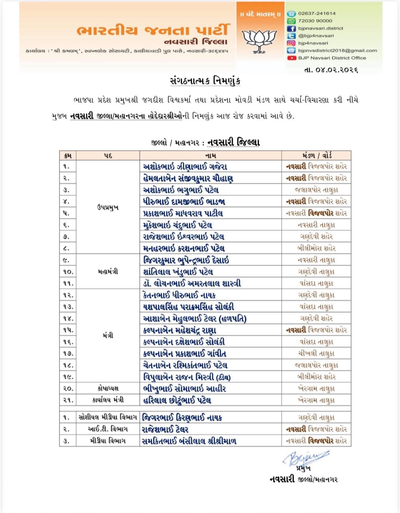 નવસારી જિલ્લા ભાજપમાં સંગઠનાત્મક ફેરફારો સાથે નવી ટીમની જાહેરાત કરવામાં આવી છે. પાર્ટીના સંગઠનને વધુ મજબૂત અને સંતુલિત બનાવવા માટે જિલ્લાનું નવું માળખું જાહેર કરાયું છે, જેમાં અનુભવ અને યુવાનીનો સમન્વય જોવા મળે છે.